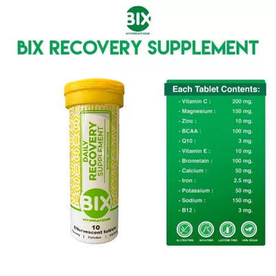 Bix Recovery effervescent tablet should be taken pre and post exercises to improve recovery times and help maintain energy levels and general well-being for athletes and active people.