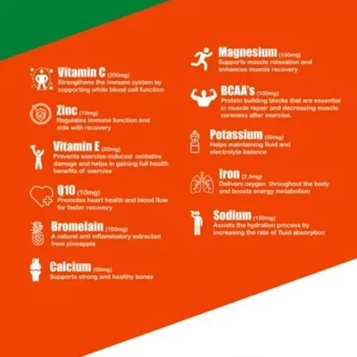 Vitamin C (L-Ascorbic Acid), Magnesium (Magnesium Carbonate), Calcium (Calcium Carbonate, Tricalcium Phosphate), Sodium (Sodium Hydrogen Carbonate), Potassium (Potassium Hydrogen Carbonate), Branched-Chain Amino Acids (BCAA’s), Bromelain Powder, Coenzyme Q10, Vitamin E (DL-a-Tocopheryl Acetate), Selenium (Sodium Selenate), Zinc (Zinc Citrate), Iron (Ferrous Gluconate), Natural Colour & Flavours. Sweetener: Sucralose.