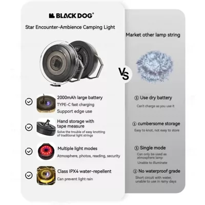 The BLACKDOG Outdoor LED String Light 10M is a beautifully designed string light that creates a warm and inviting atmosphere for camping and outdoor settings. These lights are perfect for adding a cozy ambiance to your campsite, tent, or patio. Featuring energy-efficient bulbs, they provide soft, ambient lighting that enhances the outdoor experience without being harsh. The string is lightweight and portable, making it easy to set up and transport. Durable and weather-resistant, these lights are ideal for enhancing the mood during camping trips, outdoor parties, or relaxing evenings under the stars.