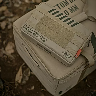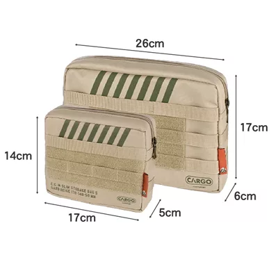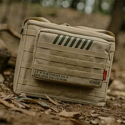 The Slim Storage Bag features a snap button on the back that can be attached to various products with webbing in a vertical position. It is designed for user convenience. The bag has foam inserts on all four sides, providing sturdy support and protecting the contents from external impacts. The front side has Velcro and webbing, allowing for the attachment of patches and other accessories.