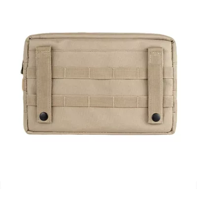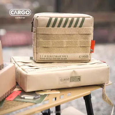 The Slim Storage Bag features a snap button on the back that can be attached to various products with webbing in a vertical position. It is designed for user convenience. The bag has foam inserts on all four sides, providing sturdy support and protecting the contents from external impacts. The front side has Velcro and webbing, allowing for the attachment of patches and other accessories.