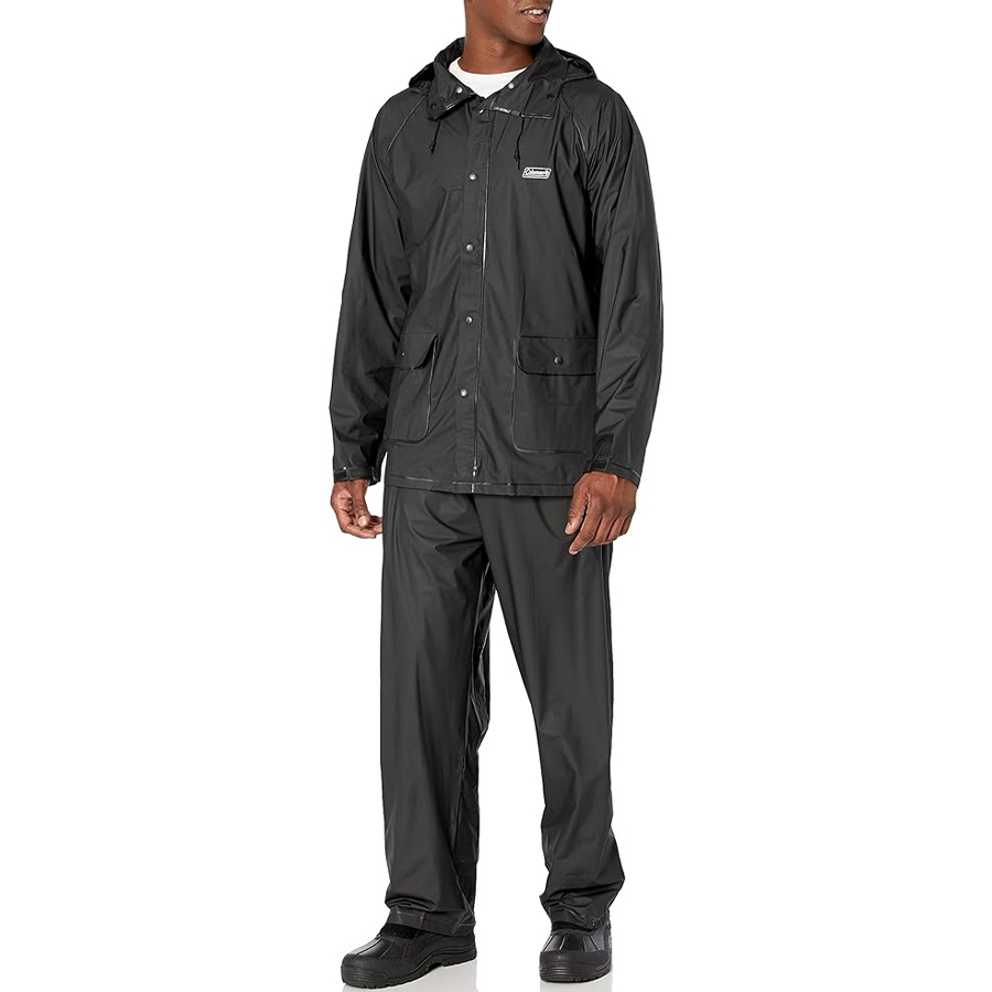 Keep yourself reliably dry and protected from the elements with the Coleman 20mm PVC Rain Suit. Constructed of durable, waterproof 20mm PVC, the Rain Suit includes a rain jacket and pants. The jacket features a stow-away drawstring-adjustable hood, snap-adjustable cuffs, and a storm flap over the center front zipper — all to keep you dry and the moisture out. There are 2 lower pockets for convenience. The pants have an elasticized waist and snap-adjustable leg openings for a good fit. The Rain Suit stores compactly in the included carry bag.