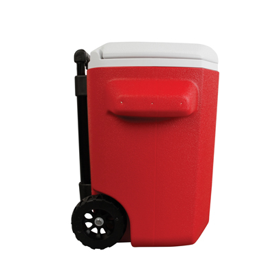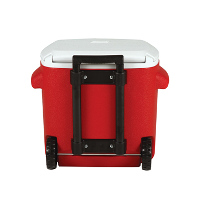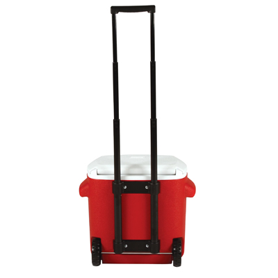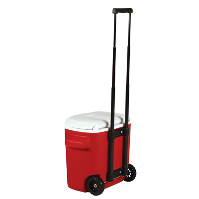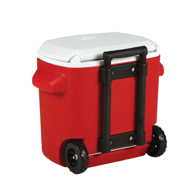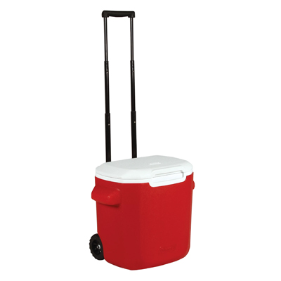 The Coleman 16 Quart Wheel Cooler rocks and rolls its durable design. This red rolling cooler is easy to wheel to your next picnic, sporting event or camping. The all-terrain wheel design makes this portable, personal cooler easy to roll on just about any surface. Coleman’s therm-ozone insulation keeps everything cold and it’s environmentally friendly too. Stand 2-liter bottles up or fill the cooler with 22 cans. This Coleman cooler has an easy-access hinged lid and 2 molded handles too. When you’re ready to roll, the retractable, telescoping handle makes moving this 16-quart cooler with wheels super easy. It’s almost like rolling luggage.