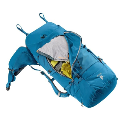 Its superior carry comfort is down to the deuter Aircontact back system with Air Spacer mesh and a large ventilation channel, plus ergonomic ActiveFit shoulder straps and an adjustable sternum strap. The Y-shaped frame, mobile hip fins and ergonomic lumbar pad combine to distribute the load effectively. A full-length, J-shaped zipper on the front makes contents easy to locate lower down in the main compartment. While large, detachable hip fin pockets (3 L) provide extra storage and keep items within reach. A zip-out 1.5-liter bottle holster also lets you hydrate on the move.