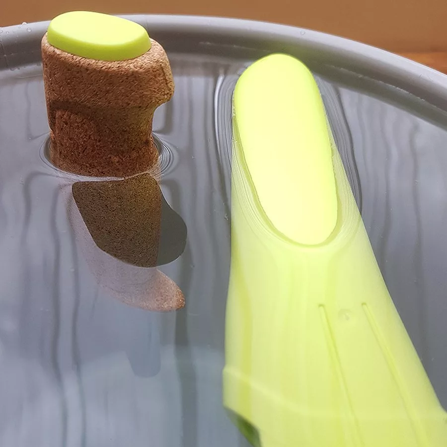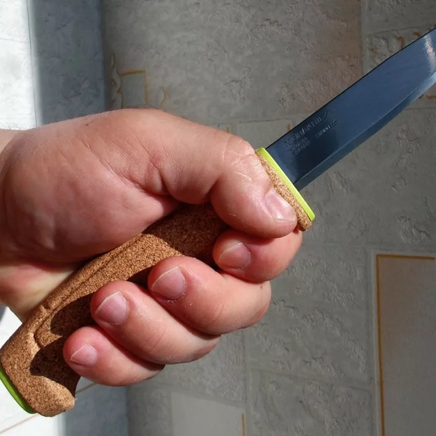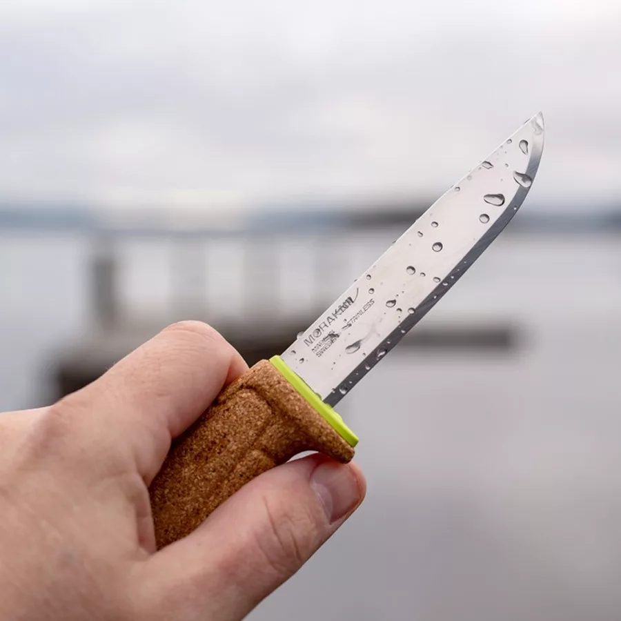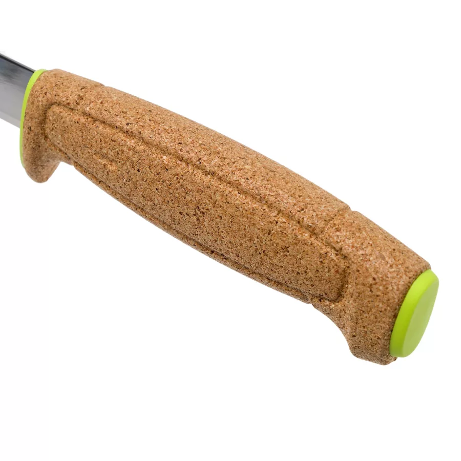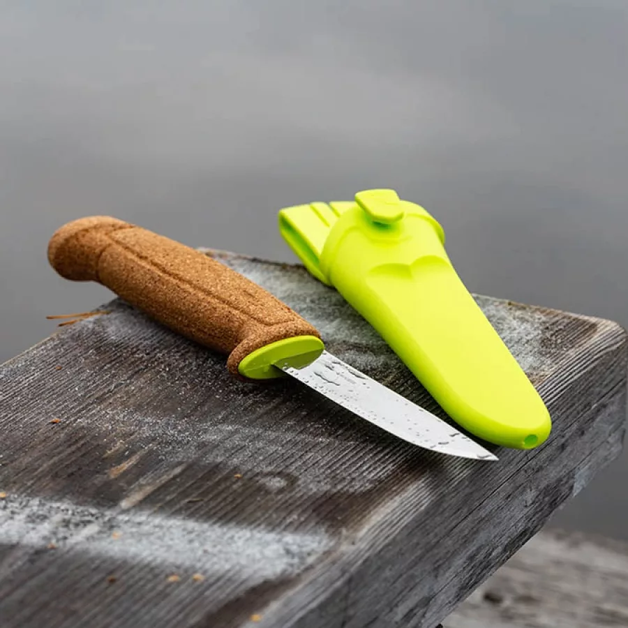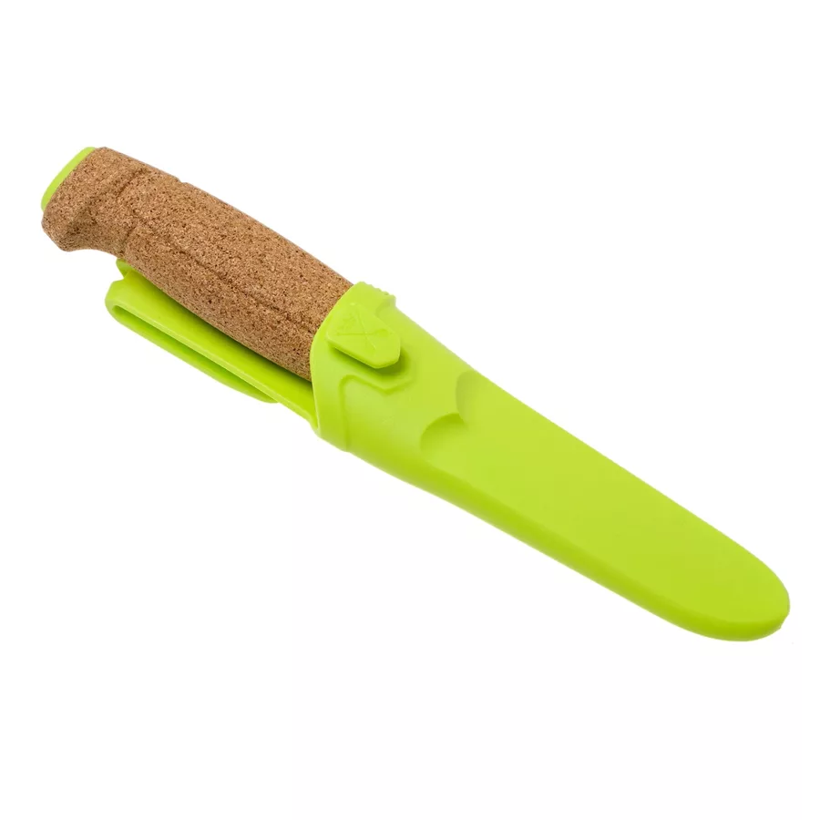 The knife that floats thanks to the natural cork handle weighs only 49 grams and has a 1.4 mm thin blade made of stainless steel. Its lime green color is highly visible in water, making it very easy to locate. Connect the knife to your belt, backpack or lifesaving vest with the clip on the sheath. It’s also possible to attach it to a button, for example on your working clothes. The highly visible lime green sheath with a smart button let you attach and link several knives from our Craft segment, giving you the opportunity to carry your preferred combination of tools that suits you.