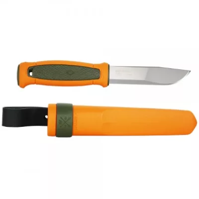 The ergonomic barrel-shaped polymer handle features a soft friction grip, finger guard and a 2.5 mm thick, polished profile-ground blade made of recycled Swedish stainless steel, which provides both strength and stability in every cut. Thanks to the blade and handle design, the knife is ideal for working safely and efficiently in various weather conditions during all seasons of the hunt. The polymer knife sheath is symmetrical, which means it suits both right and left-handed users, and has a leather strap made of Swedish vegetable-tanned leather that can be attached easily to your belt. Compatible with Morakniv Multi-Mount Kit for Kansbol.