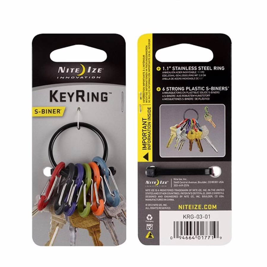Our S-Biner KeyRing features six different-colored, lightweight plastic S-Biners that attach quickly and securely to a sturdy, solid, stainless steel ring. It’s easy to hang on hooks or loop through cord. Use one of the plastic S-Biners to attach the whole unit to a second key ring, belt loop, purse strap, or zipper pull-anything with a loop or D-ring. The 6 plastic S-Biners the Key Ring comes with are perfectly sized to hold 6 separate keys, their vivid different colors allow you to identify your keys at a glance, and they attach and release from the Key Ring with ease. More S-Biners can be ordered separately-the Key Ring can hold many of them. No more fiddling with split rings or fumbling to find the key you need-the Key Ring is perfect for quick and easy sharing of keys with family members, co-workers, valets, babysitters, and for taking a single key with you when you’re out on a run or ride.