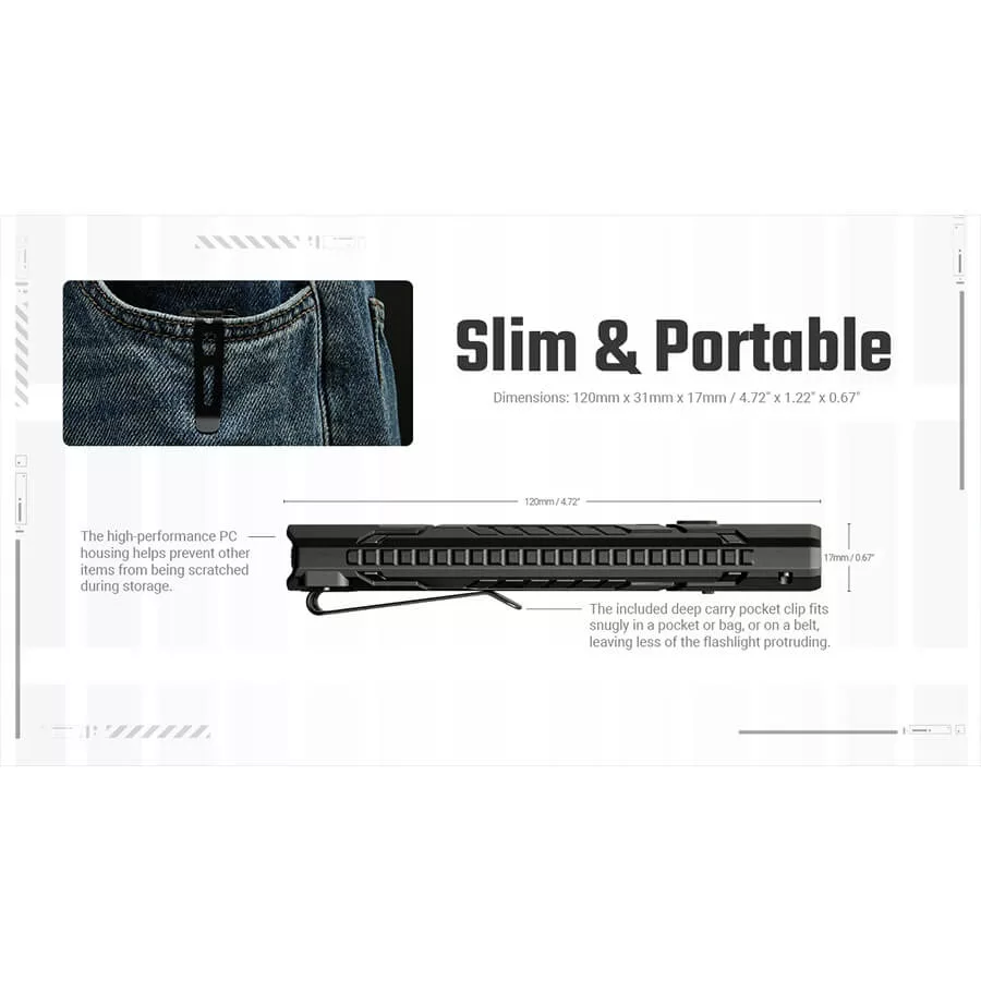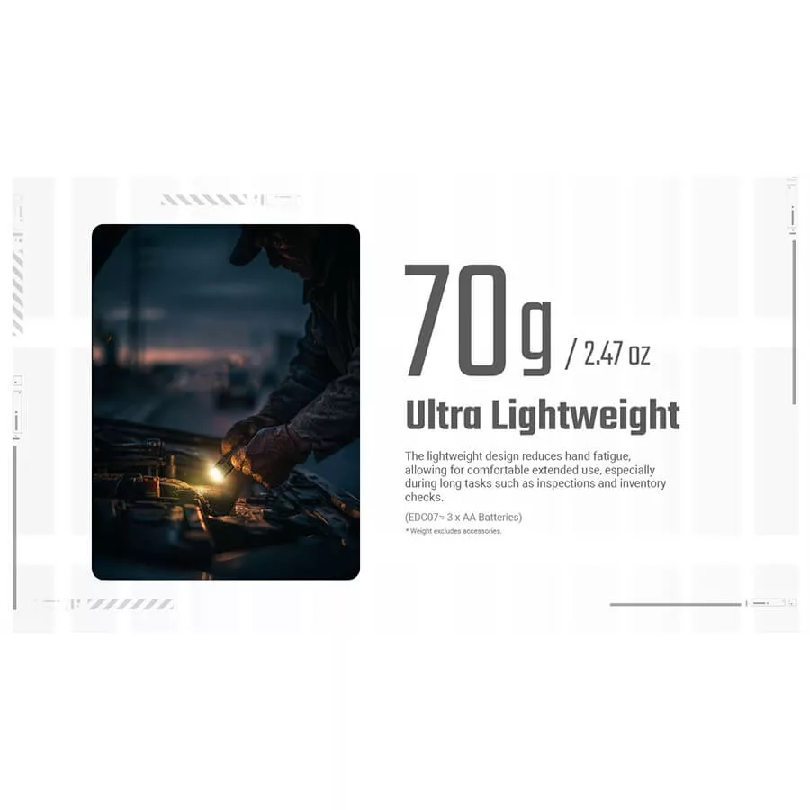 Built for dependable everyday use, EDC07 features a durable body sealed against dust and rain with an IP67 rating, making it tough enough to handle daily bumps and drops. Intuitive dual-button controls provide fast access to brightness levels, momentary illumination, and emergency modes, keeping operation simple and instinctive. With long runtimes, an ultralow mode lasting up to 360 hours, and convenient USB-C charging, EDC07 delivers a balanced blend of comfort, performance, and reliability—making it an easy choice for everyday carry.