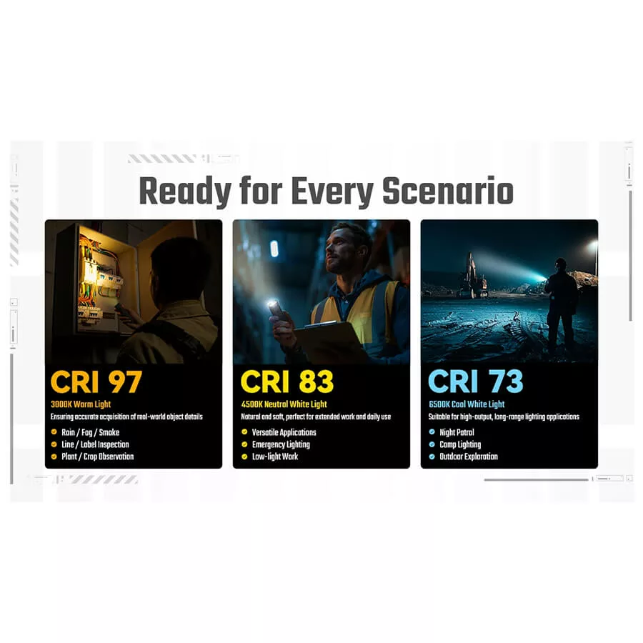 Equipped with three color temperatures: 6,500K cool white light (CRI 73), 4,500K neutral white light (CRI 83), 3,000K warm light (CRI 97)