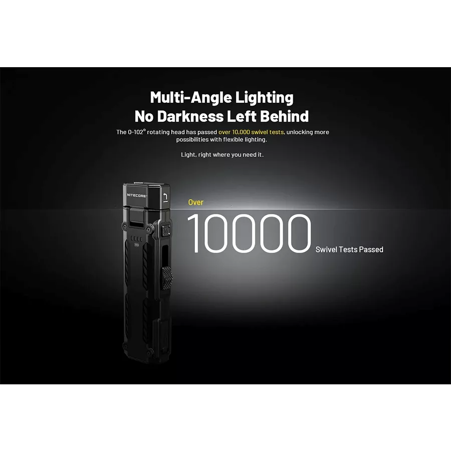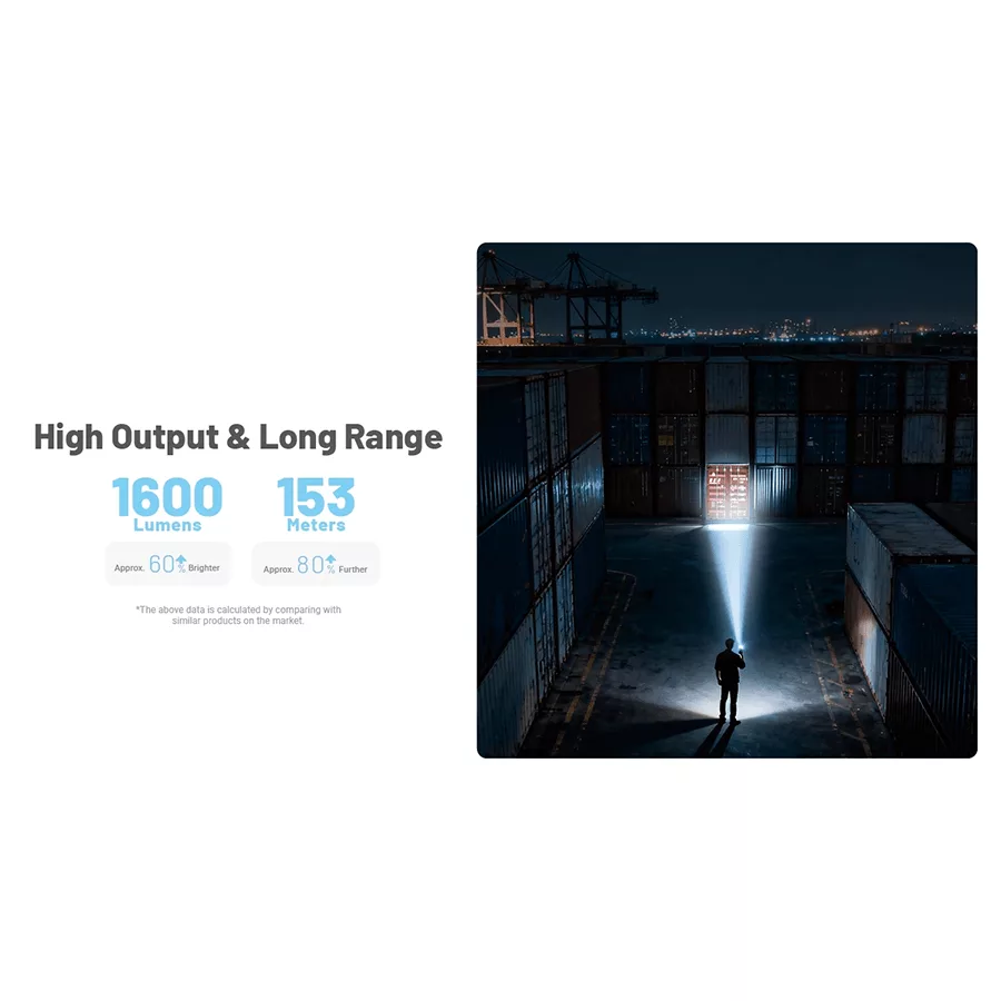 Featuring a 102° rotating head, paired with a magnetic tail and two-way clip, the flashlight provides flexible hands-free lighting and unlocks more possibilities. It delivers up to 1,600 lumens with a long throw of 153 meters, leaving no darkness behind.