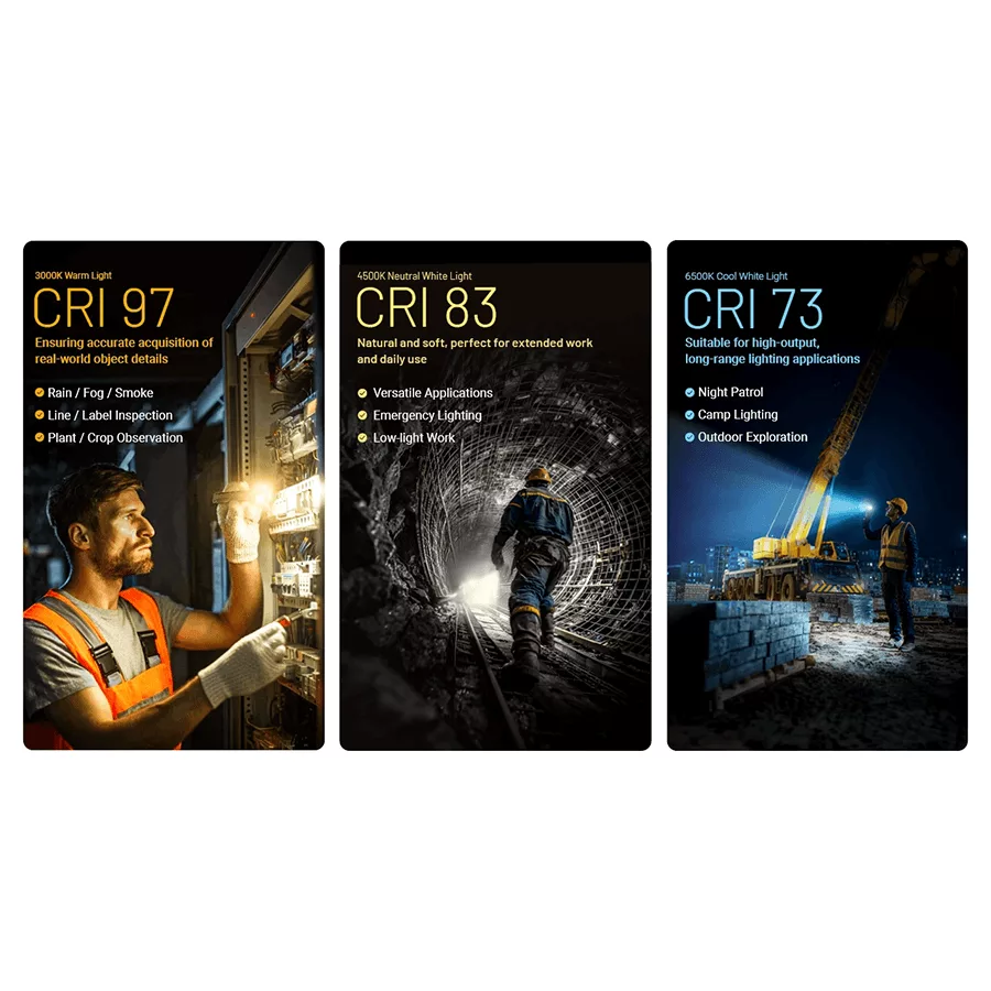 One flashlight equals three, offering three color temperatures and CRI levels: