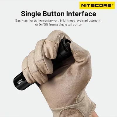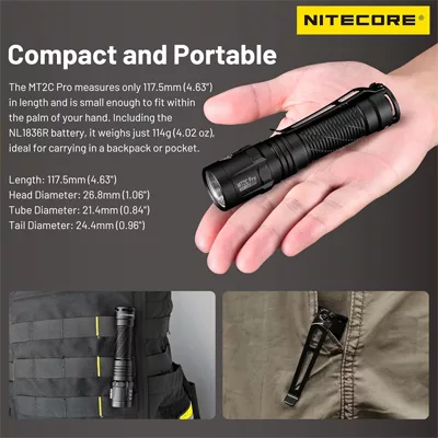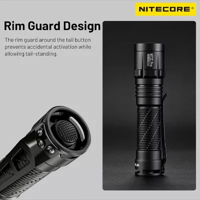 Includes a NITECORE 18650 rechargeable Li-ion battery (NL1836R 3,600mAh) with a built-in USB-C charging port, offering a runtime upo to 28 hours