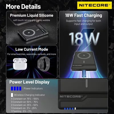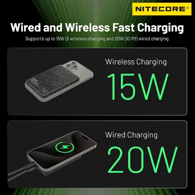 The Nitecore NW5000 is a lightweight magnetic wireless power bank with a high capacity of 5000mAh, designed for all your charging needs no matter where you are. The NW5000 supports fast charging for 15W wireless charging and features a USB-C port for wired charging. Simply snap the NW5000 to your device to trigger wireless charging. Wired charging supports both QC and PD fast charging, allowing compatible devices to be charged at up to 20W.