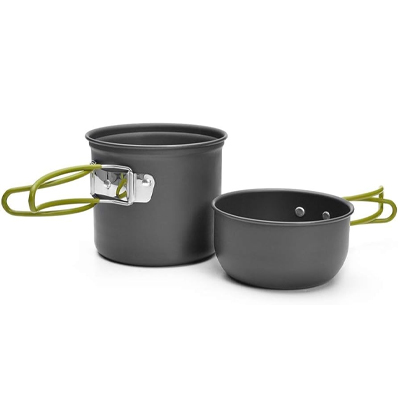 The Escape cookware is a 4-piece set of 2 lids (1 small and 1 large) and 2 pots (1 small and 1 large). With hard coating, smooth finish, and a foldable handle, these pieces are durable and convenient to carry for camping and outdoor use.