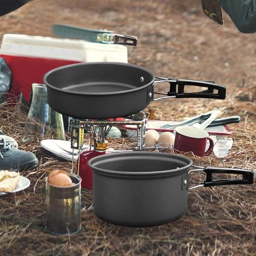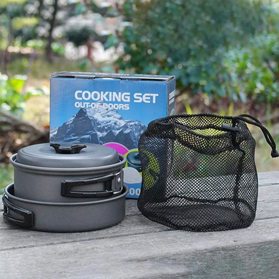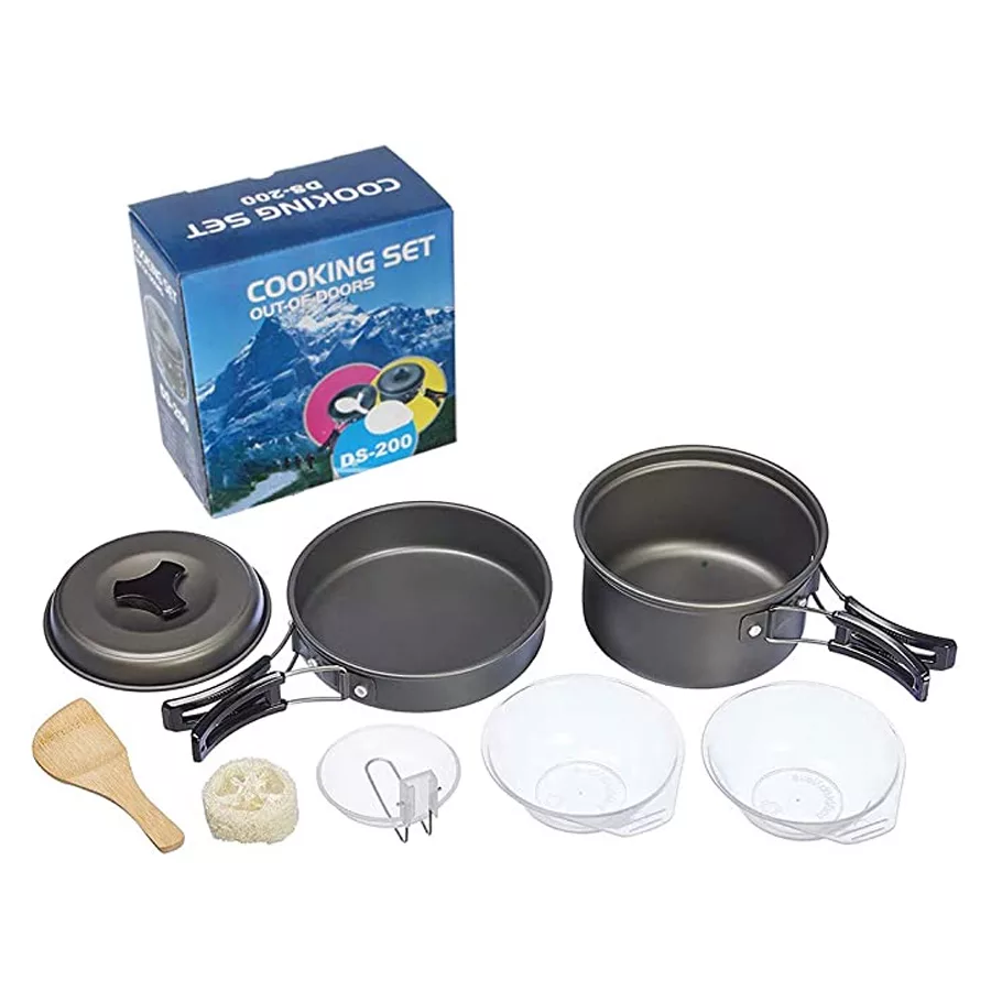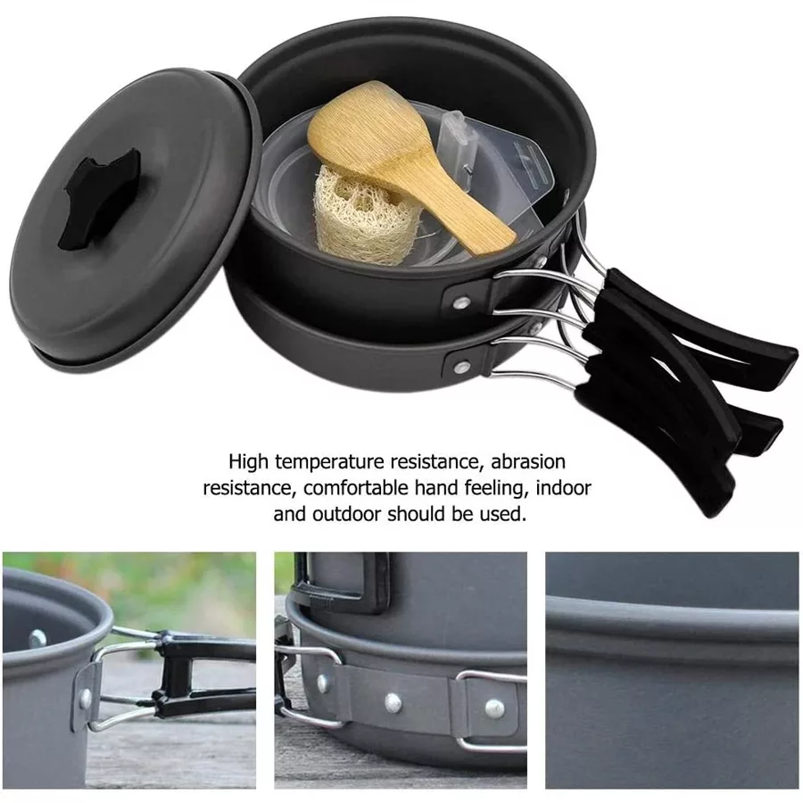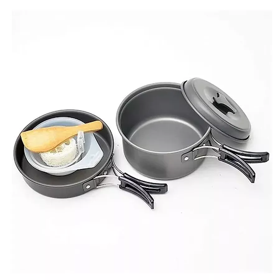 Different from ordinary steel sets pan, more durable, high temperature resistant. Suitable for 1-2 people use, including a cauldron, frying pan, a spoon, a rice ladle, two plastic bowl. Adopt import , A-grade hard high temperature resistant and good friction of aluminum. Spoon, rice ladle and plastic bowl using high hardness plastic materials.