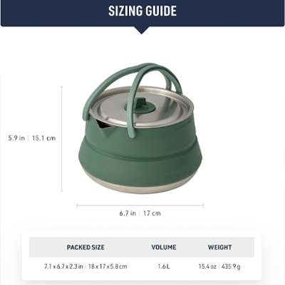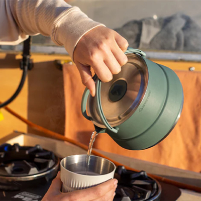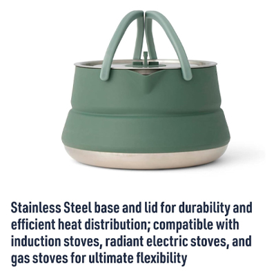 The Detour Stainless Steel Collapsible Kettle is BPA-free with heat resistant silicone for safe and seamless mealtimes. The stainless steel base is an efficient heat conductor for extra-fast boiling.