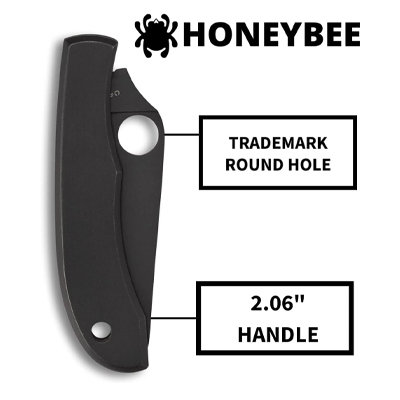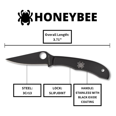 The micro-sized slip joints are fully functional cutting tools small enough to fit on a keychain. The Trademark Round Holes proudly identify them as Spyderco knives and offer convenient, fingernail-free openings. Painstakingly crafted from stainless steel, the HoneyBee is now available in a handsome all-black finish. Both the blade and handle have a durable black oxide coating that accentuates its no-nonsense functionality.