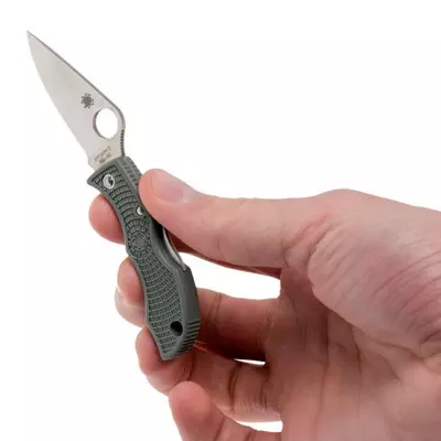 Spyderco Ladybugs are small, innocuous, cut like the devil, carry commendably on a keychain and become an indispensable tool for your EDC. Foliage green is the green hue used in the U.S. Army’s digital camouflage. It has the curious ability to shade-shift from green to gray blending into surrounding colors and backgrounds. The modified clip-point VG-10 blade is hollow-ground. Uniform thick from heel to tip, the blade delivers durability and strength. The FRN (fiberglass reinforced nylon) handle is Bi-Directionally Textured™ and comfortably angular in every way the hand can comfortably grip it. The relative position of the Spyderco Round Hole to the pivot and back-lock was key in its design so that even though very small, the folder opens one-handedly and provides the perception of being larger in the hand than it truly is. Ladybugs are clipless, and fitted with a lanyard hole for attachment to a keychain or thong.